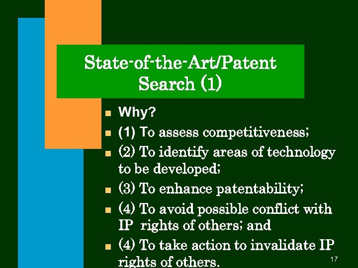 State-of-the-Art/Patent Search (1) n n n Why? (1) To assess competitiveness; (2) To identify areas of technology to be developed; (3) To enhance patentability; (4) To avoid possible conflict with IP rights of others; and (4) To take action to invalidate IP 17 rights of others.