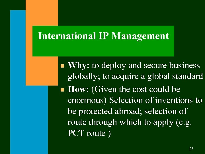 International IP Management n n Why: to deploy and secure business globally; to acquire a global standard How: (Given the cost could be enormous) Selection of inventions to be protected abroad; selection of route through which to apply (e. g. PCT route ) 27