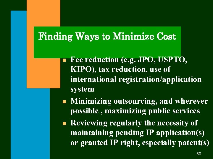 Finding Ways to Minimize Cost n n n Fee reduction (e. g. JPO, USPTO, KIPO), tax reduction, use of international registration/application system Minimizing outsourcing, and wherever possible , maximizing public services Reviewing regularly the necessity of maintaining pending IP application(s) or granted IP right, especially patent(s) 30