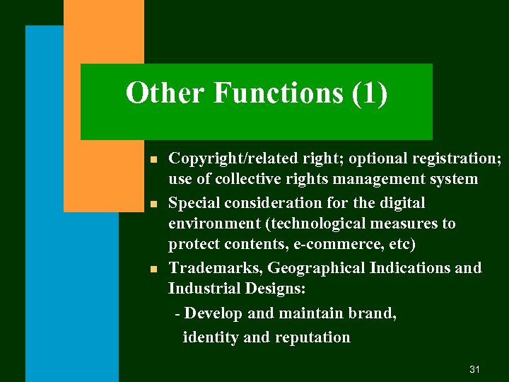 Other Functions (1) n n n Copyright/related right; optional registration; use of collective rights management system Special consideration for the digital environment (technological measures to protect contents, e-commerce, etc) Trademarks, Geographical Indications and Industrial Designs: - Develop and maintain brand, identity and reputation 31