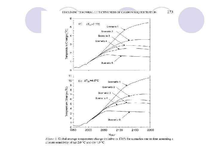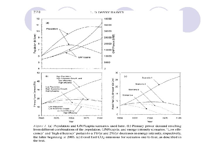 Emission Scenarios l Emissions based on: ¡ population (P) ¡ economic output (dollars) person ($/P) ¡ average primary energy consumption (joules) per dollar of economic output (J/S) ¡ average CO 2 emission per joule of primary energy consumption (E/J) l Emission = P x ($/P) x (J/S) x (E/J) l l l Scenario 1: CO 2 6. 5 Gt. C/yr in 2000 10 27 Gt. C/yr 2100 Scenario 2: CO 2 peak 9 Gt. C/yr in 2060 then decline to 7 Gt. C/yr by 2100 Scenario 3: CO 2 peak 7. 7 Gt. C/yr in 2030 then decline to 0 Gt. C by 2100 Scenario 4: CO 2 decline from 6. 9 Gt. C/yr in 2005 then decline to 0 by 2075 Scenario 5: N/A