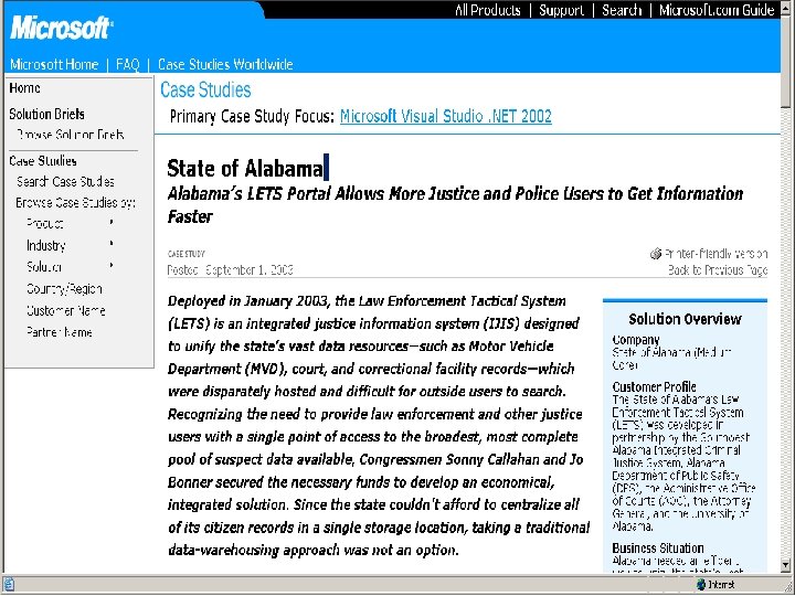 ALABAMA CASE STUDY: LETS • Law Enforcement Tactical System – Web-based information delivery system – For law enforcement and criminal justice • Involved Departments: – – – Administrative Office of Courts Alabama Criminal Justice Information Center Department of Public Safety Law Enforcement Systems Integration/Standards Attorney General’s Office Department of Revenue
