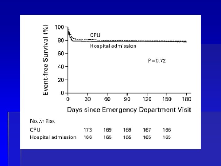 A Clinical Trial of a Chest-Pain Observation Unit for Patients with Unstable Angina (CHEER) Faroukh et al. NEJM. 1998; 339: 1882 -1888 § Prospectively, randomized intermediate risk patients to CPU vs hospital-admission § N=424 § Primary outcomes: § § § nonfatal myocardial infarction death acute congestive heart failure Stroke out-of-hospital cardiac arrest § Cost comparison