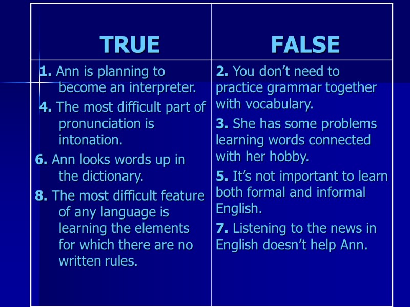 Ann thinks about: learning grammar; 2. learning vocabulary (words and idioms); 3. learning pronunciation; 4. reading; 5. listening to pop music, the radio, watching videos and educational TV programmes. You need to practice grammar together with vocabulary It’s better to learn a few words at a time and practice them It’s important to learn both formal and informal English You need to look words up in the dictionary and make a note of the most useful ones You need to listen to them