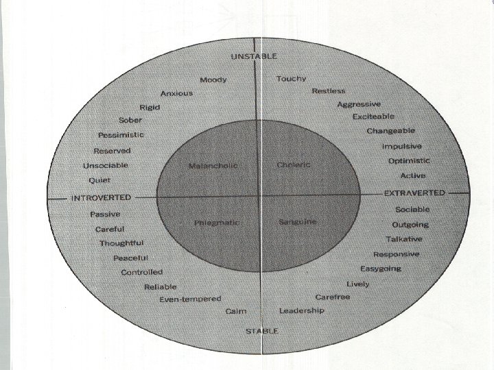 Organizing traits • From 450 B. C. to present • Organizing structure for personality • Eysenck’s three personality “factors” to describe all relevant personality traits – 1. extraversion/introversion -ARAS – 2. neuroticism/emotional stability -limbic system – 3. psychoticism (abnormal personality) /ego strength (tolerate stress, reality focus) - Circumplex model (for the normal population)