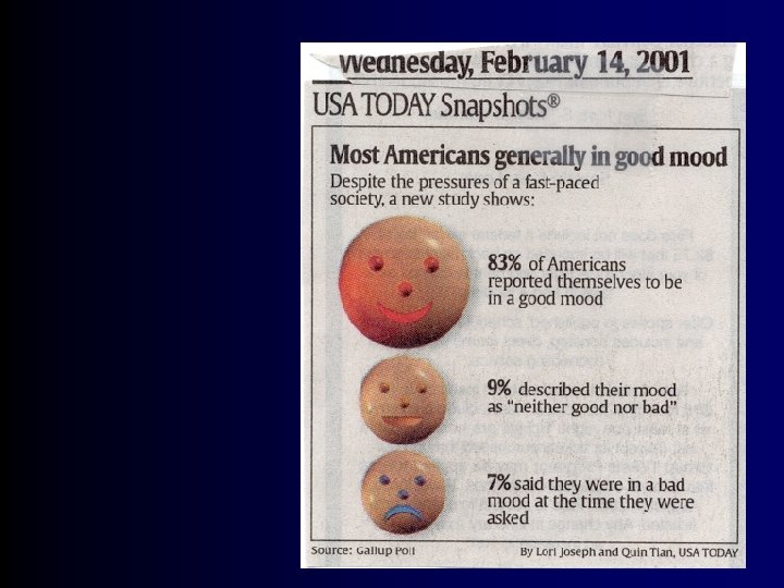 Can we trust these self-reports? • Are happy people “in denial”? • The happiness thermometers may read a little high, yet. . . • Self-report measures are: – reliable – correlated with experience samplings – correlated with positive indicators – correlated with others’ reports – the only measures of subjective well-being