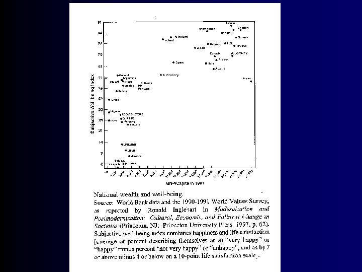 Subjective Well-Being of 82 Countries (Combined happiness and life satisfaction, from 1999 -2001 World Values Surveys reported by R. Inglehart, 2004) • • • Puerto Rico Mexico Denmark Ireland Iceland Switzerland Northern Ireland Columbia Netherlands. . . USA (#15) • • • . . . Bulgaria Belarus Georgia Romania Moldova Russia Armenia Ukraine Zimbabwe Indonesia