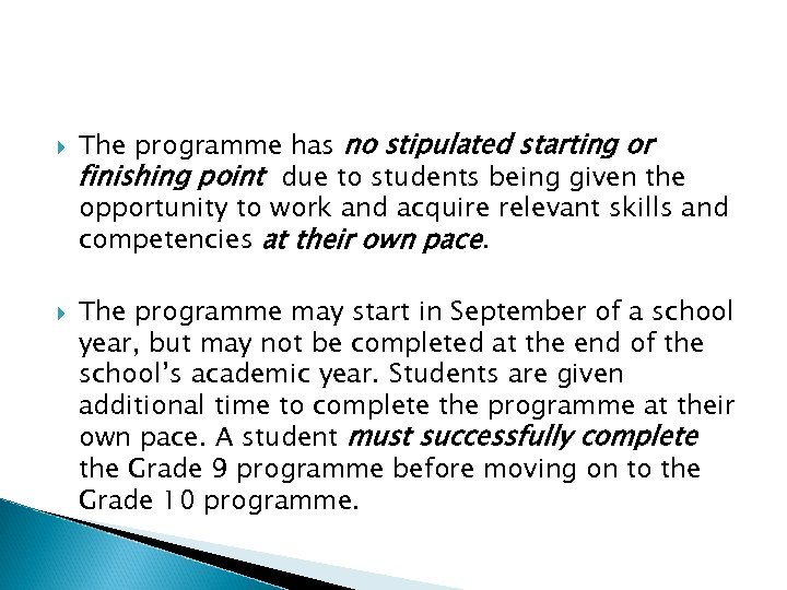 The programme has no stipulated starting or finishing point due to students being given the opportunity to work and acquire relevant skills and competencies at their own pace. The programme may start in September of a school year, but may not be completed at the end of the school’s academic year. Students are given additional time to complete the programme at their own pace. A student must successfully complete the Grade 9 programme before moving on to the Grade 10 programme.