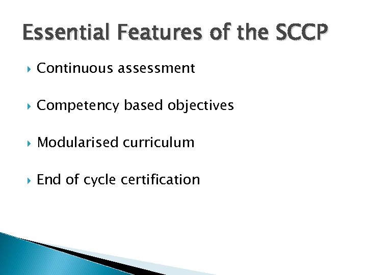 Essential Features of the SCCP Continuous assessment Competency based objectives Modularised curriculum End of cycle certification