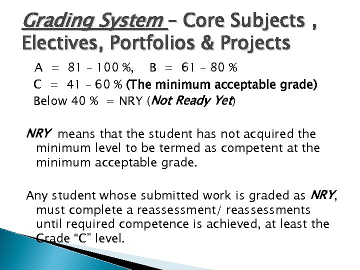 Grading System – Core Subjects , Electives, Portfolios & Projects A = 81 – 100 %, B = 61 – 80 % C = 41 – 60 % (The minimum acceptable grade) Below 40 % = NRY (Not Ready Yet) NRY means that the student has not acquired the minimum level to be termed as competent at the minimum acceptable grade. Any student whose submitted work is graded as NRY, must complete a reassessment/ reassessments until required competence is achieved, at least the Grade “C” level.