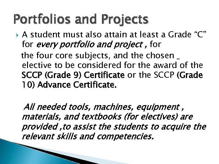 Portfolios and Projects A student must also attain at least a Grade “C” for every portfolio and project , for the four core subjects, and the chosen elective to be considered for the award of the SCCP (Grade 9) Certificate or the SCCP (Grade 10) Advance Certificate. All needed tools, machines, equipment , materials, and textbooks (for electives) are provided , to assist the students to acquire the relevant skills and competencies.