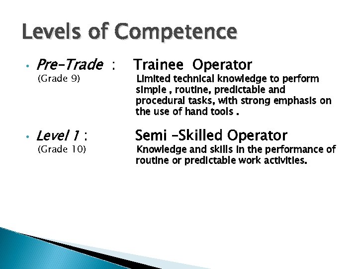 Levels of Competence • Pre–Trade : Trainee Operator • Level 1 : Semi –Skilled Operator (Grade 9) (Grade 10) Limited technical knowledge to perform simple , routine, predictable and procedural tasks, with strong emphasis on the use of hand tools. Knowledge and skills in the performance of routine or predictable work activities.