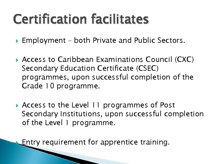 Certification facilitates Employment – both Private and Public Sectors. Access to Caribbean Examinations Council (CXC) Secondary Education Certificate (CSEC) programmes, upon successful completion of the Grade 10 programme. Access to the Level 11 programmes of Post Secondary Institutions, upon successful completion of the Level 1 programme. Entry requirement for apprentice training.