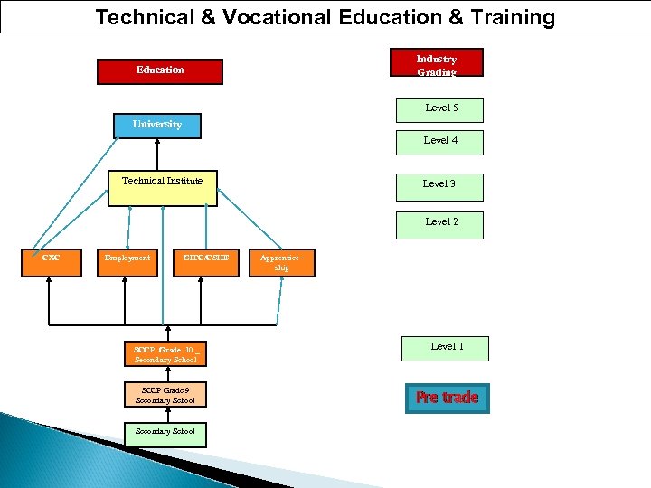 Technical & Vocational Education & Training Industry Grading Education Level 5 University Level 4 Technical Institute Level 3 Level 2 CXC Employment GITC/CSHE SCCP Grade 10 _ Secondary School SCCP Grade 9 Secondary School Apprentice ship Level 1 Pre trade