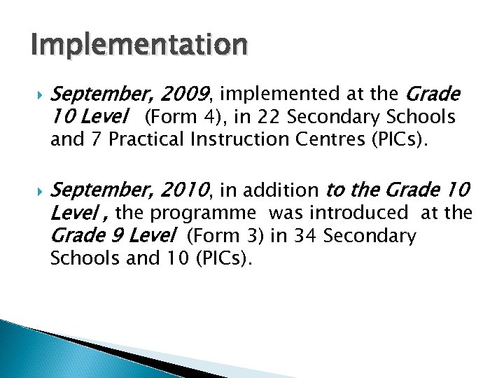 Implementation September, 2009, implemented at the Grade 10 Level (Form 4), in 22 Secondary Schools and 7 Practical Instruction Centres (PICs). September, 2010, in addition to the Grade 10 Level , the programme was introduced at the Grade 9 Level (Form 3) in 34 Secondary Schools and 10 (PICs).