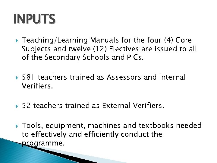 INPUTS Teaching/Learning Manuals for the four (4) Core Subjects and twelve (12) Electives are issued to all of the Secondary Schools and PICs. 581 teachers trained as Assessors and Internal Verifiers. 52 teachers trained as External Verifiers. Tools, equipment, machines and textbooks needed to effectively and efficiently conduct the programme.
