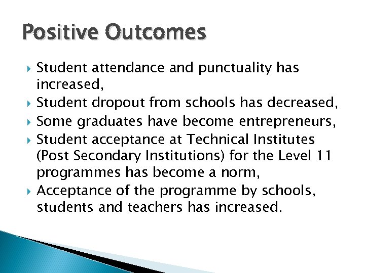 Positive Outcomes Student attendance and punctuality has increased, Student dropout from schools has decreased, Some graduates have become entrepreneurs, Student acceptance at Technical Institutes (Post Secondary Institutions) for the Level 11 programmes has become a norm, Acceptance of the programme by schools, students and teachers has increased.