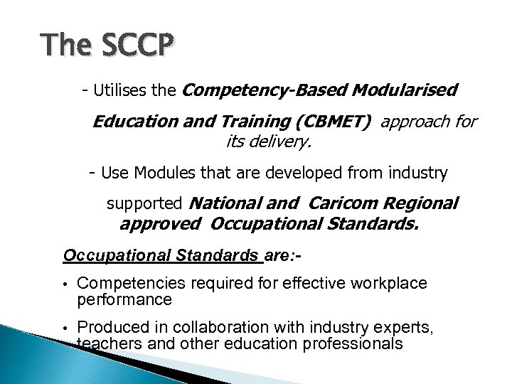 The SCCP - Utilises the Competency-Based Modularised Education and Training (CBMET) approach for its delivery. - Use Modules that are developed from industry supported National and Caricom Regional approved Occupational Standards are: • Competencies required for effective workplace performance • Produced in collaboration with industry experts, teachers and other education professionals