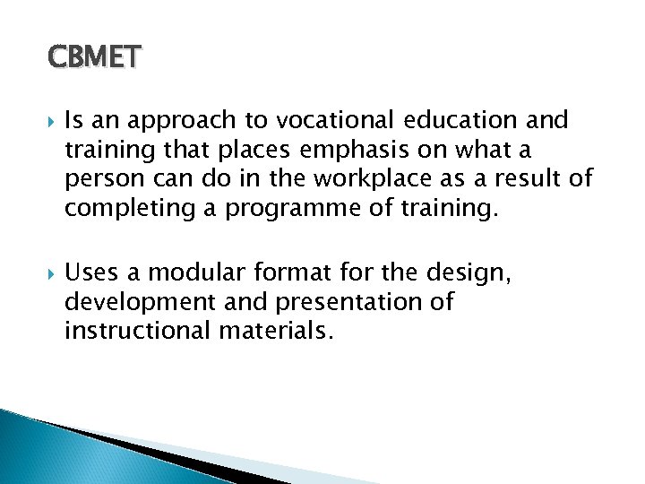 CBMET Is an approach to vocational education and training that places emphasis on what a person can do in the workplace as a result of completing a programme of training. Uses a modular format for the design, development and presentation of instructional materials.