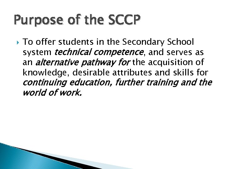 Purpose of the SCCP To offer students in the Secondary School system technical competence, and serves as an alternative pathway for the acquisition of knowledge, desirable attributes and skills for continuing education, further training and the world of work.