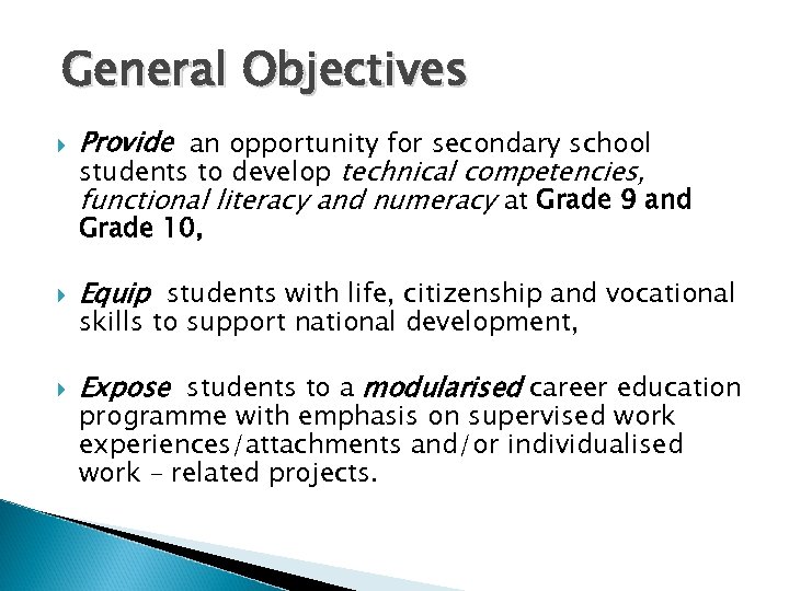 General Objectives Provide an opportunity for secondary school students to develop technical competencies, functional literacy and numeracy at Grade 9 and Grade 10, Equip students with life, citizenship and vocational Expose students to a modularised career education skills to support national development, programme with emphasis on supervised work experiences/attachments and/or individualised work – related projects.