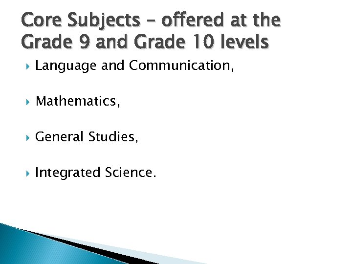 Core Subjects – offered at the Grade 9 and Grade 10 levels Language and Communication, Mathematics, General Studies, Integrated Science.