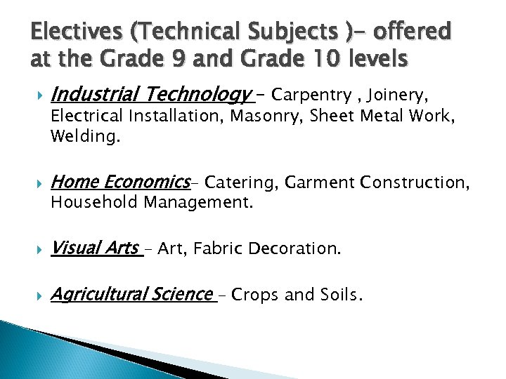 Electives (Technical Subjects )- offered at the Grade 9 and Grade 10 levels Industrial Technology – Carpentry , Joinery, Home Economics– Catering, Garment Construction, Visual Arts – Art, Fabric Decoration. Agricultural Science – Crops and Soils. Electrical Installation, Masonry, Sheet Metal Work, Welding. Household Management.