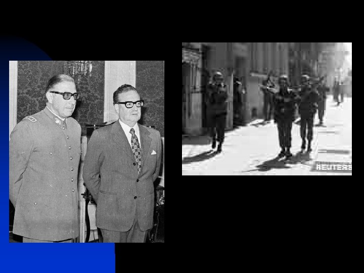 • On September 11, 1973, the Chilean military, led by General Pinochet – commander in chief of the army - staged the coup against Allende. • It is known that the United States played a role in Chilean politics prior to the coup, but its degree of involvement in the coup itself is debated. • The CIA was notified by its Chilean contacts of the impending coup two days in advance, but contends it "played no direct role in" the coup. • After Pinochet assumed power, U. S. Secretary of State Henry Kissinger told U. S. President Richard Nixon that the U. S. "didn't do it" (referring to the coup itself) but had "created the conditions as great as possible", including leading economic sanctions.