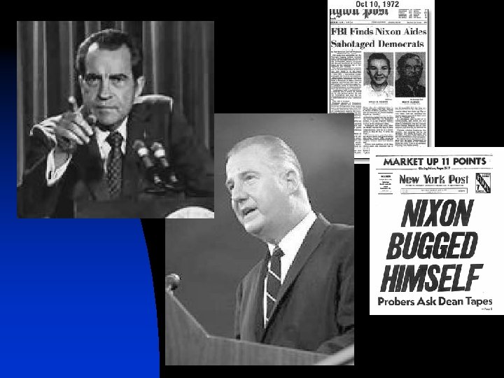 • Nixon’s Vice President – Spiro Agnew had resigned when it was announced he was being investigated for extortion, bribery and income-tax violations while governor of Maryland. • During the Watergate investigation, more than 30 Nixon administration officials, campaign officials, and financial contributors pleaded guilty or were found guilty of breaking the law. • It was made public that the White House had a system of audio surveillance that was used to record conversations and telephone calls – these tapes were instrumental in detailing Nixon’s involvement with the subsequent cover-up.