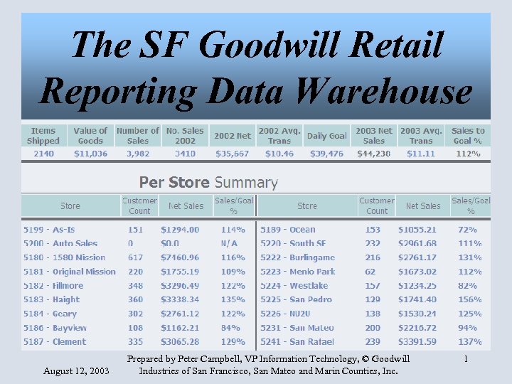 The SF Goodwill Retail Reporting Data Warehouse August 12, 2003 Prepared by Peter Campbell, VP Information Technology, © Goodwill Industries of San Francisco, San Mateo and Marin Counties, Inc. 1