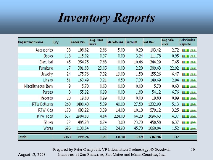 Inventory Reports August 12, 2003 Prepared by Peter Campbell, VP Information Technology, © Goodwill Industries of San Francisco, San Mateo and Marin Counties, Inc. 10