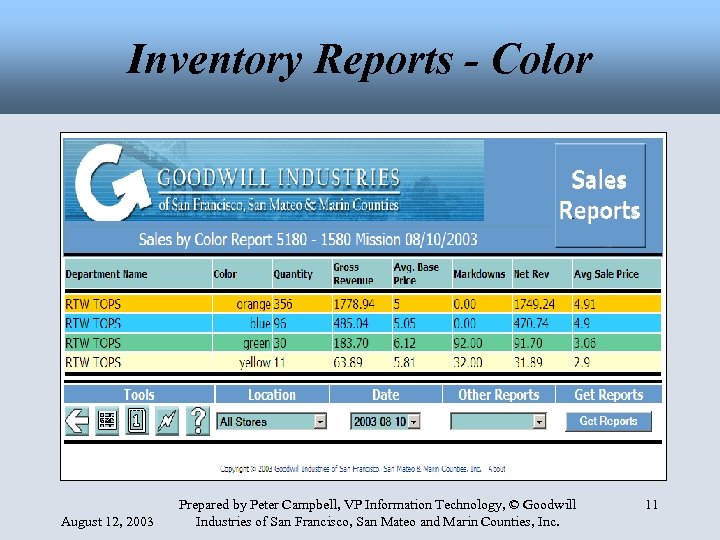 Inventory Reports - Color August 12, 2003 Prepared by Peter Campbell, VP Information Technology, © Goodwill Industries of San Francisco, San Mateo and Marin Counties, Inc. 11