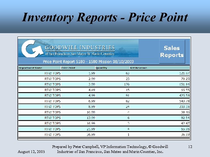 Inventory Reports - Price Point August 12, 2003 Prepared by Peter Campbell, VP Information Technology, © Goodwill Industries of San Francisco, San Mateo and Marin Counties, Inc. 12