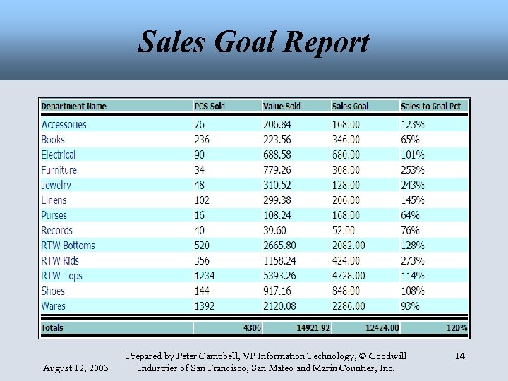 Sales Goal Report August 12, 2003 Prepared by Peter Campbell, VP Information Technology, © Goodwill Industries of San Francisco, San Mateo and Marin Counties, Inc. 14