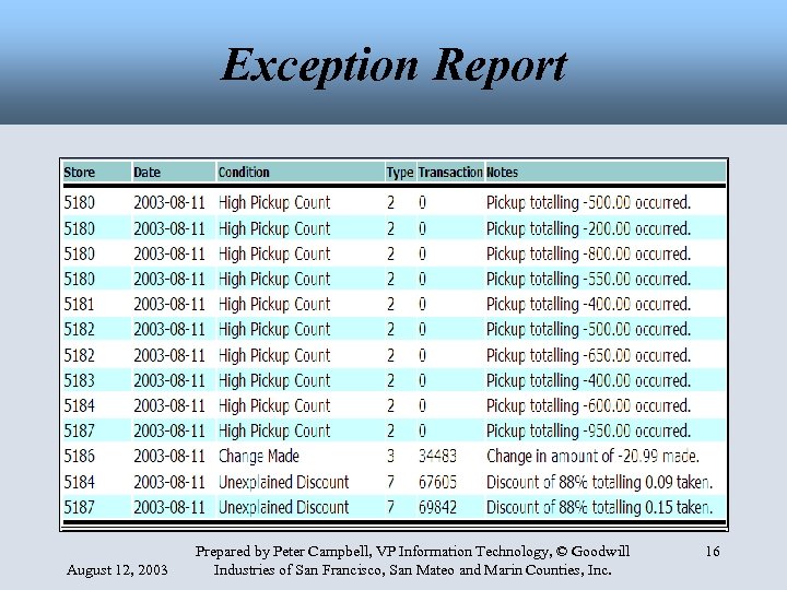 Exception Report August 12, 2003 Prepared by Peter Campbell, VP Information Technology, © Goodwill Industries of San Francisco, San Mateo and Marin Counties, Inc. 16