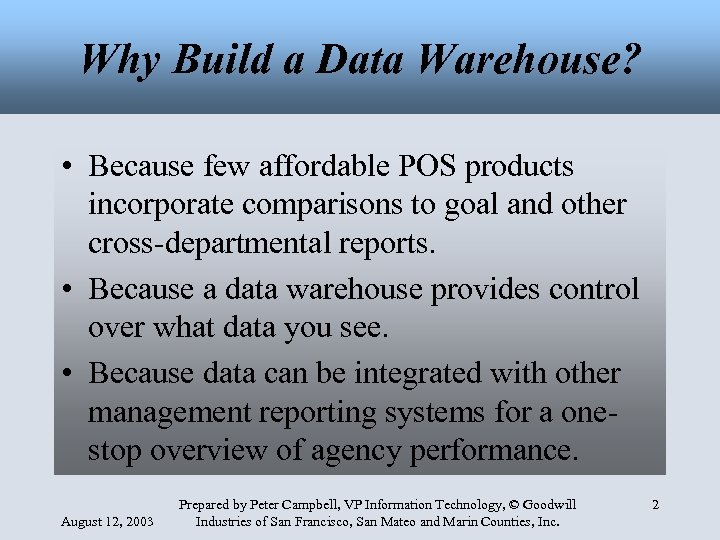 Why Build a Data Warehouse? • Because few affordable POS products incorporate comparisons to goal and other cross-departmental reports. • Because a data warehouse provides control over what data you see. • Because data can be integrated with other management reporting systems for a onestop overview of agency performance. August 12, 2003 Prepared by Peter Campbell, VP Information Technology, © Goodwill Industries of San Francisco, San Mateo and Marin Counties, Inc. 2