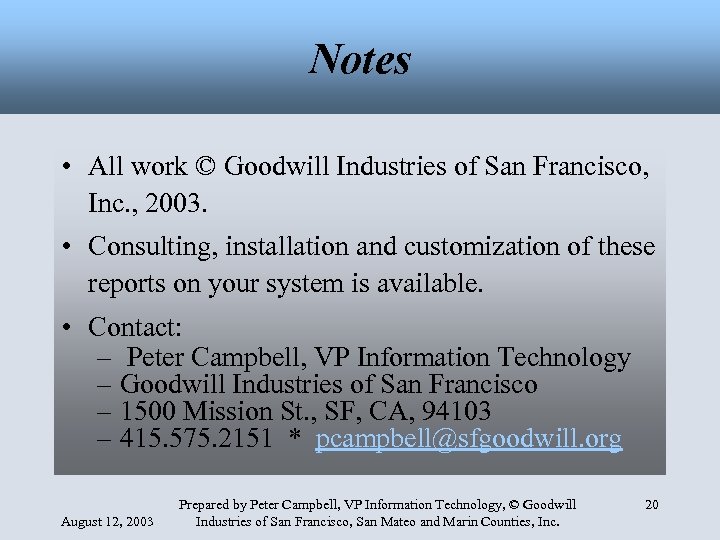 Notes • All work © Goodwill Industries of San Francisco, Inc. , 2003. • Consulting, installation and customization of these reports on your system is available. • Contact: – Peter Campbell, VP Information Technology – Goodwill Industries of San Francisco – 1500 Mission St. , SF, CA, 94103 – 415. 575. 2151 * pcampbell@sfgoodwill. org August 12, 2003 Prepared by Peter Campbell, VP Information Technology, © Goodwill Industries of San Francisco, San Mateo and Marin Counties, Inc. 20