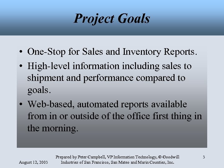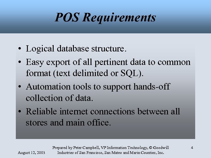 Project Goals • One-Stop for Sales and Inventory Reports. • High-level information including sales to shipment and performance compared to goals. • Web-based, automated reports available from in or outside of the office first thing in the morning. August 12, 2003 Prepared by Peter Campbell, VP Information Technology, © Goodwill Industries of San Francisco, San Mateo and Marin Counties, Inc. 3