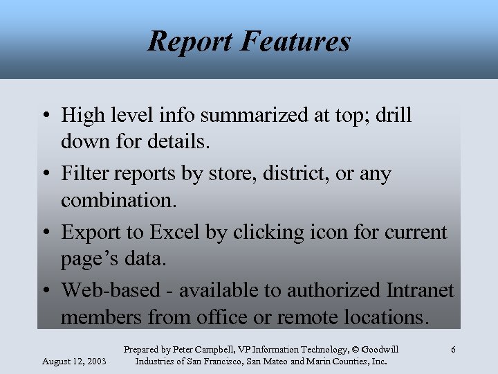 Warehouse Requirements • Simple to read, drill-down reporting • No duplicate data entry - all sales and inventory to be pulled from POS system; sales/inventory goals to be entered annually. • Standardized design tools - SQL, HTML and PHP with documentation of all code. August 12, 2003 Prepared by Peter Campbell, VP Information Technology, © Goodwill Industries of San Francisco, San Mateo and Marin Counties, Inc. 5
