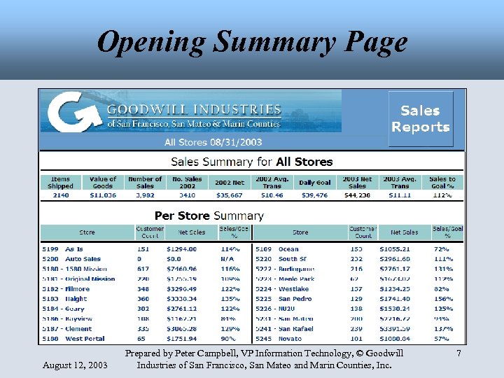 Opening Summary Page August 12, 2003 Prepared by Peter Campbell, VP Information Technology, © Goodwill Industries of San Francisco, San Mateo and Marin Counties, Inc. 7