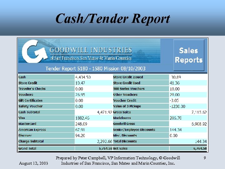 Cash/Tender Report August 12, 2003 Prepared by Peter Campbell, VP Information Technology, © Goodwill Industries of San Francisco, San Mateo and Marin Counties, Inc. 9
