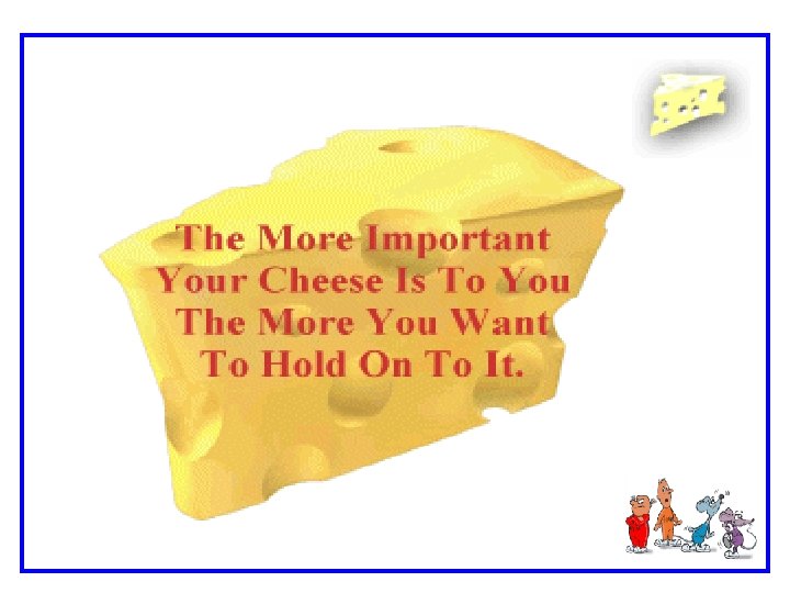 • Old beliefs do not lead you to new cheese. • When you see that you can dine and enjoy new cheese you change course. • Noticing small changes early helps you adapt to the bigger changes that are to come. • Move with the cheese, and enjoy it !