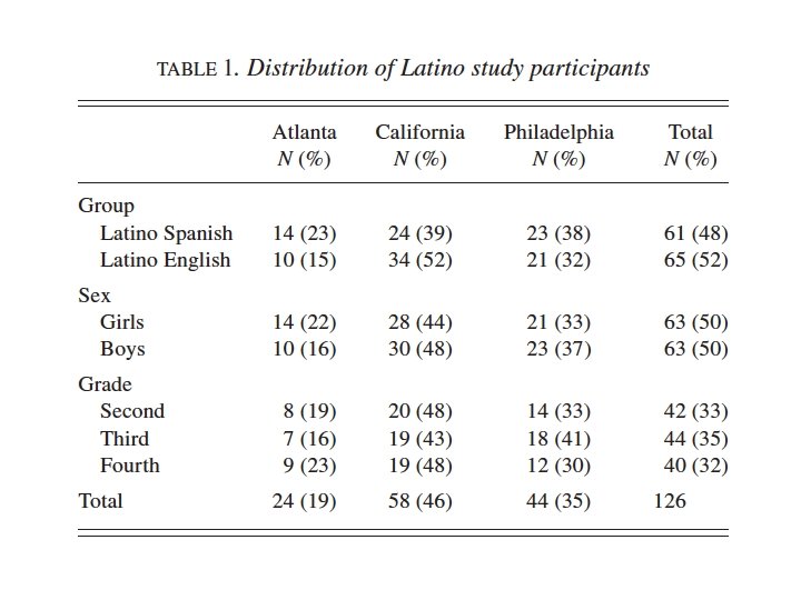 The reading research program Number of subjects by language/ethnic group and geographic region for the year 2003 -2004 (N=246) Language/ethnic group in Phila in Calif Total African American 19 33 52 Caucasian 40 17 57 Latino Spanish readers 37 37 74 Latino English readers 37 26 63 Total: ___________133_______ 113_____ 246