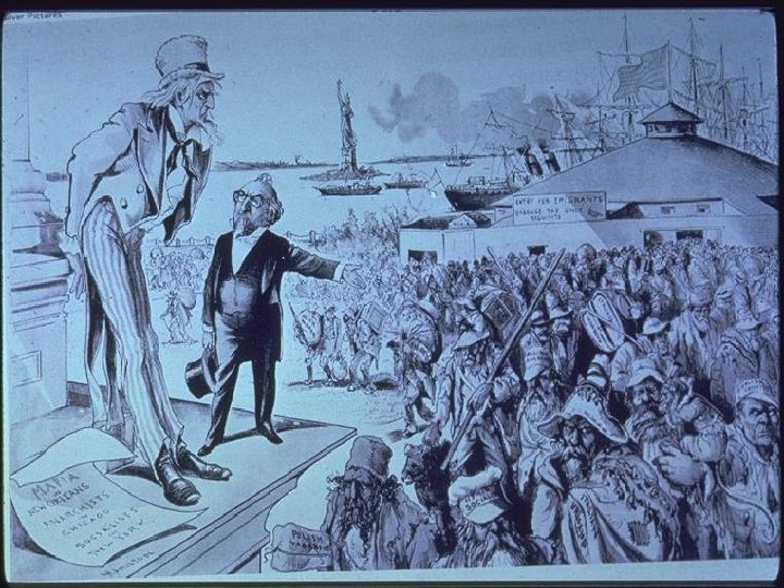 Notes about this image: The views of Senator Lodge and his supporters: "Where the Blame Lies. Judge [to Uncle Sam]: 'If immigration was properly restricted you would no longer be troubled with anarchy, socialism, the Mafia, and such kindred evils!'" Caption on sign in background: "Entry for emigrants, baggage the only requisite. " Captions on immigrants: "Polish vagabond, Italian brigand, English convict, Russian anarchist, Irish pauper. " 1891. Citation: Grant Hamilton cartoon. Judge, 1891. Library of Congress Prints and Photographs Division, Washington, D. C. 20540. LCUSZC 4 -5739. In Wayne Moquin, ed. , Makers of America, Vol. 5, William Benton, Publisher, 1971, p. 60. 11. 5. 2, 11. 6. 5