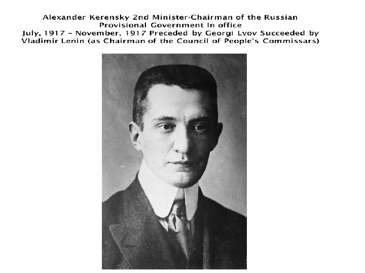 • Prince Georgi Lvov 1 st Minister-Chairman of Russain Provisional Government In office. • March 23, 1917 – July 7, 1917 Preceded by Nicholas II (Tsar) succeeded by Alexander Kerensky.