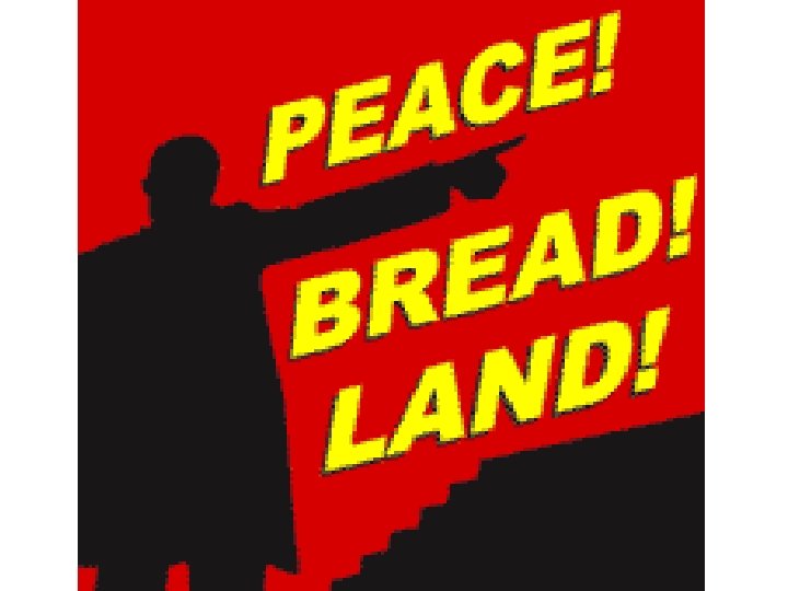 Bread, Land Peace • • • The Bolsheviks were prepared to take advantage of this split within the Duma. The Bolsheviks represented the majority of members inside the Petrograd and Moscow Soviets, Lenin moved to seize control of the government On 25 th of October 1917 (Nov. 7 th 1917, in the new calendar) strategic locations in Petrograd (including the Winter Palace) were stormed by Red Bolshevik troops. Members of the provisional government were arrested and Soviet authority was established. The provisional government had failed despite much progressive legislation. (it had given political prisoners amnesty, abolished capital punishment, granted the right to strike and removed restrictions based on class, nationality or religion) However, its inability to solve discontent among the farmers and peasants that worked in the agricultural sectors by redistributing land to the people, and the continuation of the war, led to economic and social breakdown and ultimately the collapse of public support for the provisional government. The charismatic personality of Lenin and the promise of bread, land, and peace proved popular to a population desperate for change Very Pro Lenin Bio Part Two just as pro communist How do these videos create a pro communist position? How does this differ from other information about the Communist Revolution you have been exposed to? Lenin promised to distribute land to the peasants, give control of the factories to the workers and take Russia out of the war. These promises gave Lenin the support of the population which allowed the Bolsheviks to take control of the government in 1917.