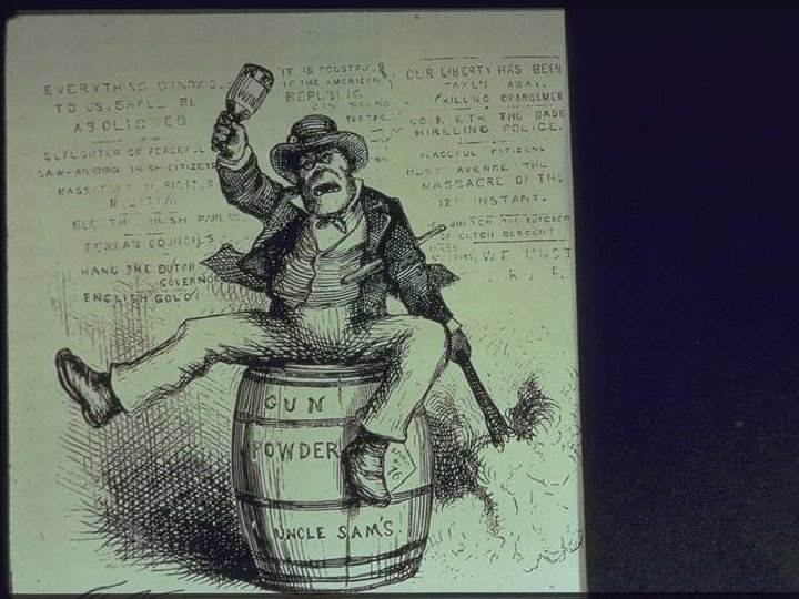 Notes about this image: "The Usual Irish Way of Doing Things, " a savage anti-Irish cartoon, 1871. Captions on walls: "Everything obnoxious to us shall be abolished, Our liberty has been taken away (killing Orangemen), We must rule. " Caption on barrel: "Uncle Sam's Gun Powder. " Citation: Thomas Nast cartoon. Harper's Weekly, Sept. 2, 1871. In Wayne Moquin, ed. , Makers of America, Vol. 4, William Benton, Publisher, 1971, p. 177. 8. 12. 5