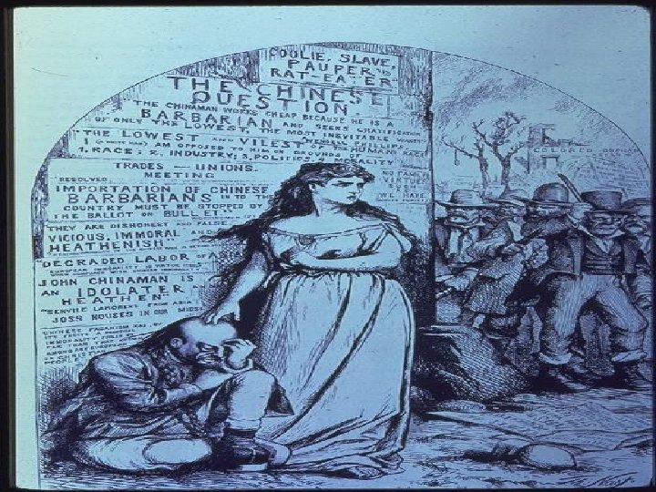notes about this image: "Hands off, gentlemen! America means fair play for all men. " This 1871 cartoon shows the hatred directed toward the Chinese. The Irish, first in pursuit, had previously been the target of earlier immigrant groups. Captions on signs: "If our ballots will not stop them coming to our country, the bullet must!, Riots by 'Pure White' strikers, Europeans are the bulk of our 'American' pauperism. " Citation: Thomas Nast cartoon. Harper's Weekly, Feb. 18, 1871. Library of Congress Prints and Photographs Division, Washington, DC 20540. LC-USZ 62 -53346. In Wayne Moquin, ed. , Makers of America, Vol. 4, William Benton, Publisher, 1971, p. 83. 8. 12. 7