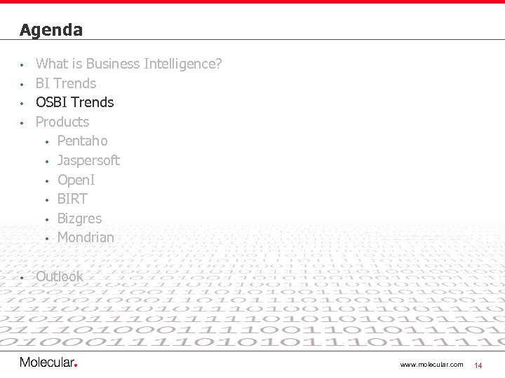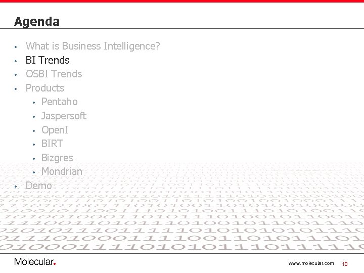 Agenda • • • What is Business Intelligence? BI Trends OSBI Trends Products • Pentaho • Jaspersoft • Open. I • BIRT • Bizgres • Mondrian Demo www. molecular. com 10