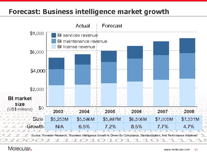 Forecast: Business intelligence market growth Actual $8, 000 Forecast BI services revenue BI maintenance revenue BI license revenue $6, 000 $4, 000 $2, 000 BI market size (US$ millions) $0 Size Growth 2003 2004 2005 2006 2007 2008 $5, 253 M $5, 596 M $5, 997 M $6, 506 M $7, 005 M $7, 331 M N/A 6. 5% 7. 2% 8. 5% 7. 7% 4. 7% Source: Forrester Research, “Business Intelligence Growth Is Driven By Compliance, Standardization, And Performance Initiatives” www. molecular. com 11